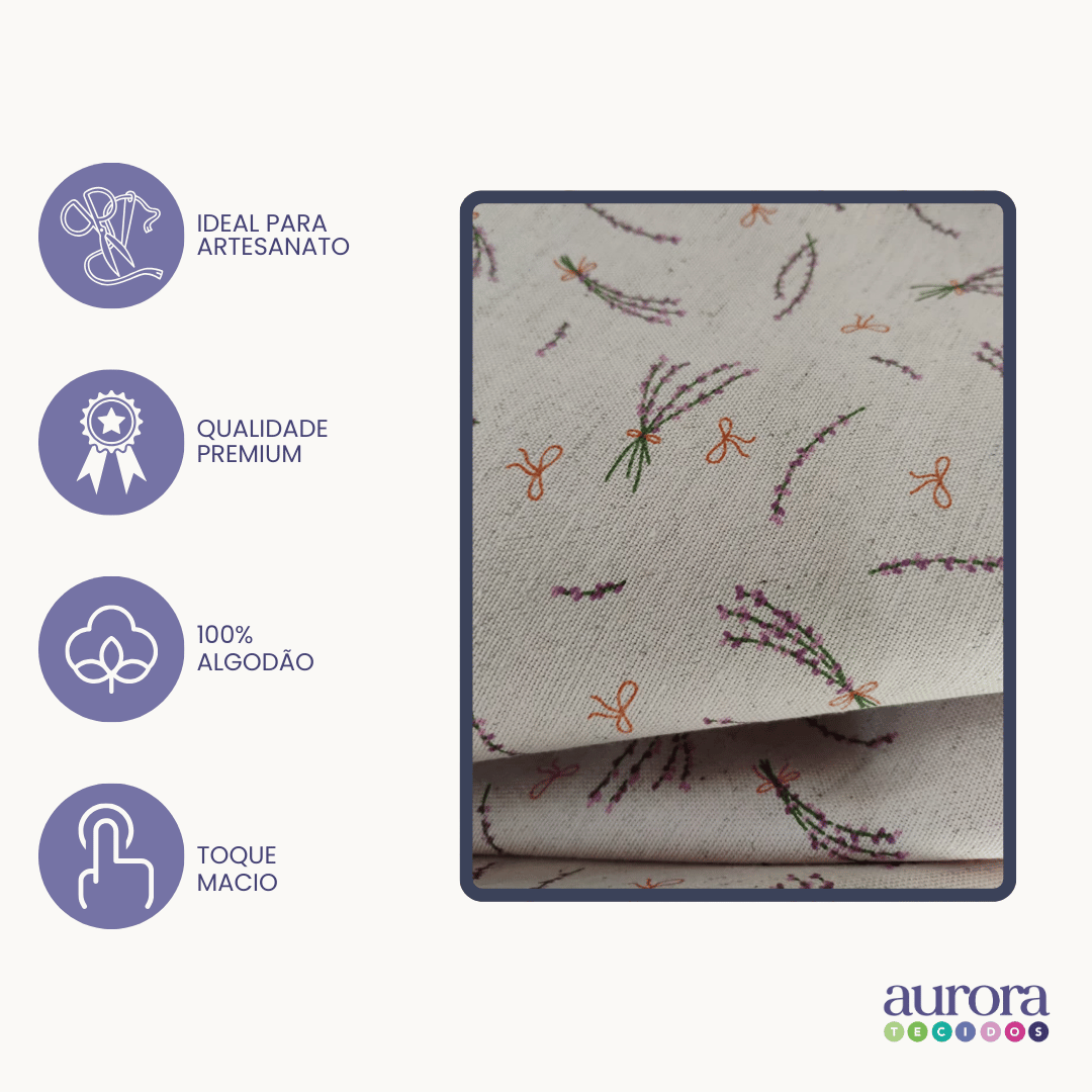 Você esta vendo o produto: "Tecido Linho com Algodão - Coleção Artesanato - Estampa Lavanda e Laços"