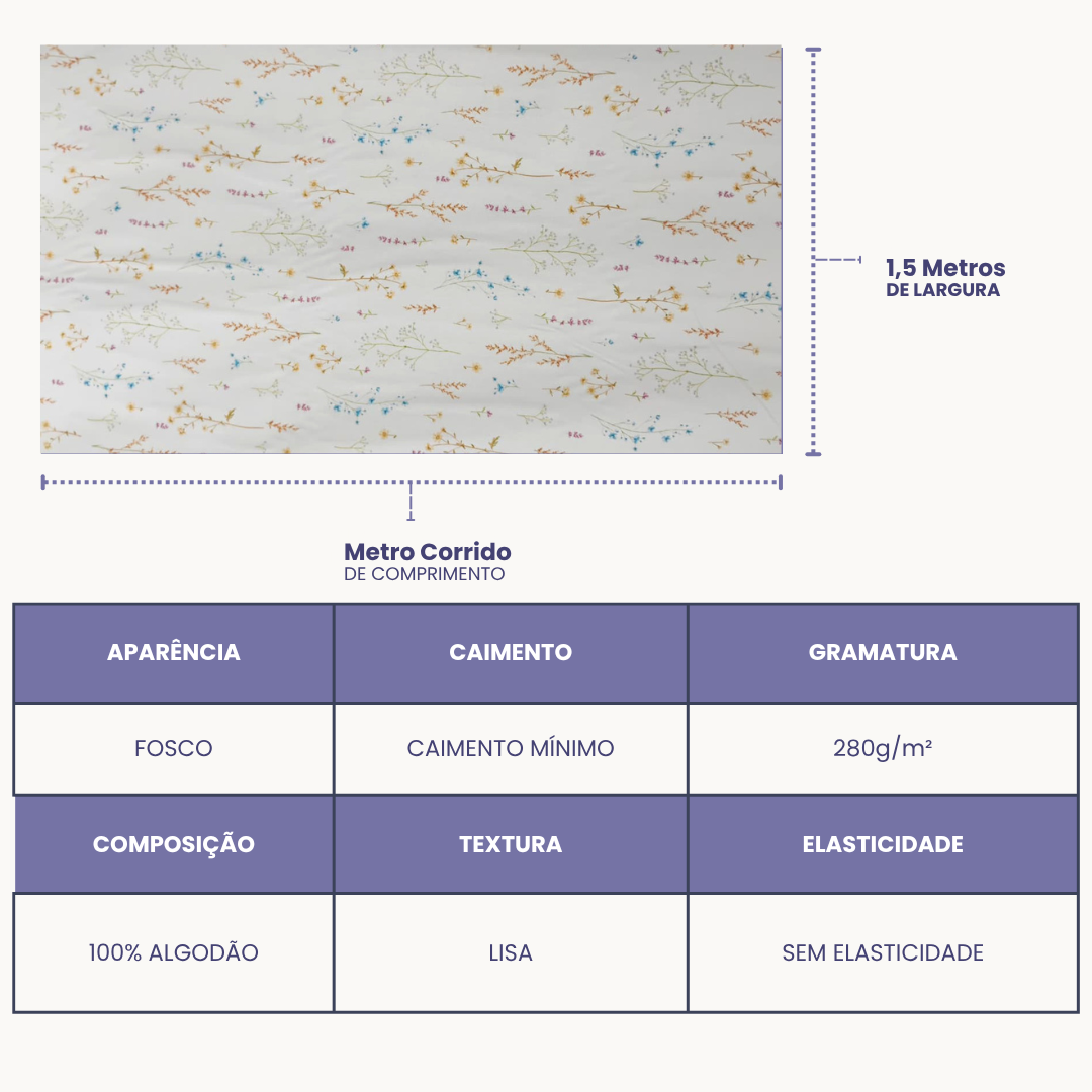 Tecido leve (gramatura média) e fácil de costurar, garantindo caimento perfeito e acabamento impecável.