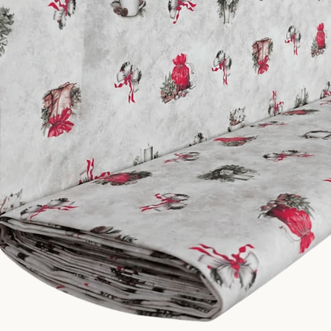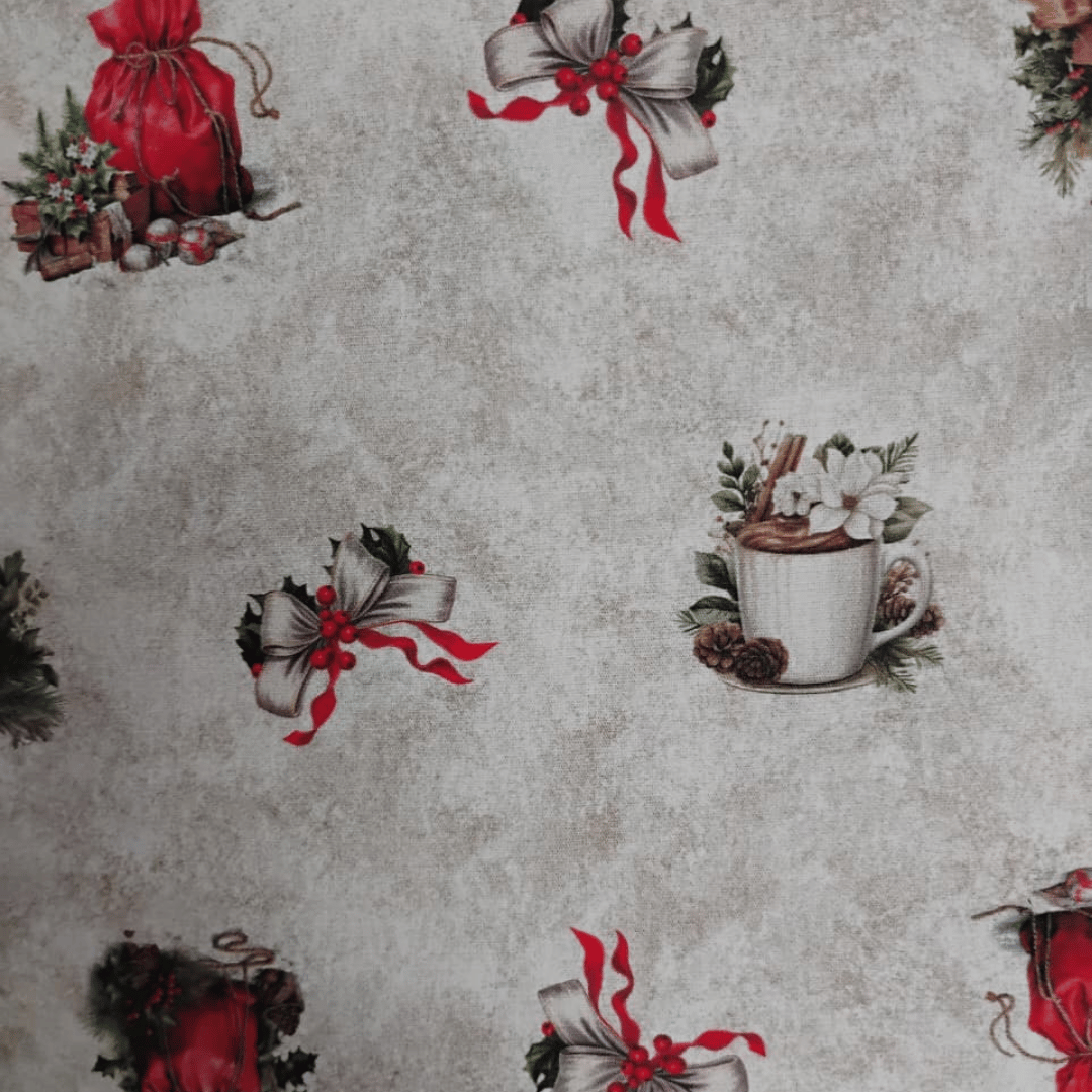 Transforme seus projetos em verdadeiras obras natalinas com a Tricoline Digital 100% Algodão - Estampa Encanto Natalino, uma peça encantadora da nossa Coleção Natal. Com uma composição artística e rica em elementos clássicos como flores, sinos, laços, folhagens e toques dourados, essa estampa transmite toda a magia e sofisticação que o Natal inspira.
