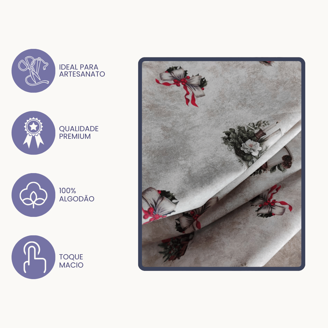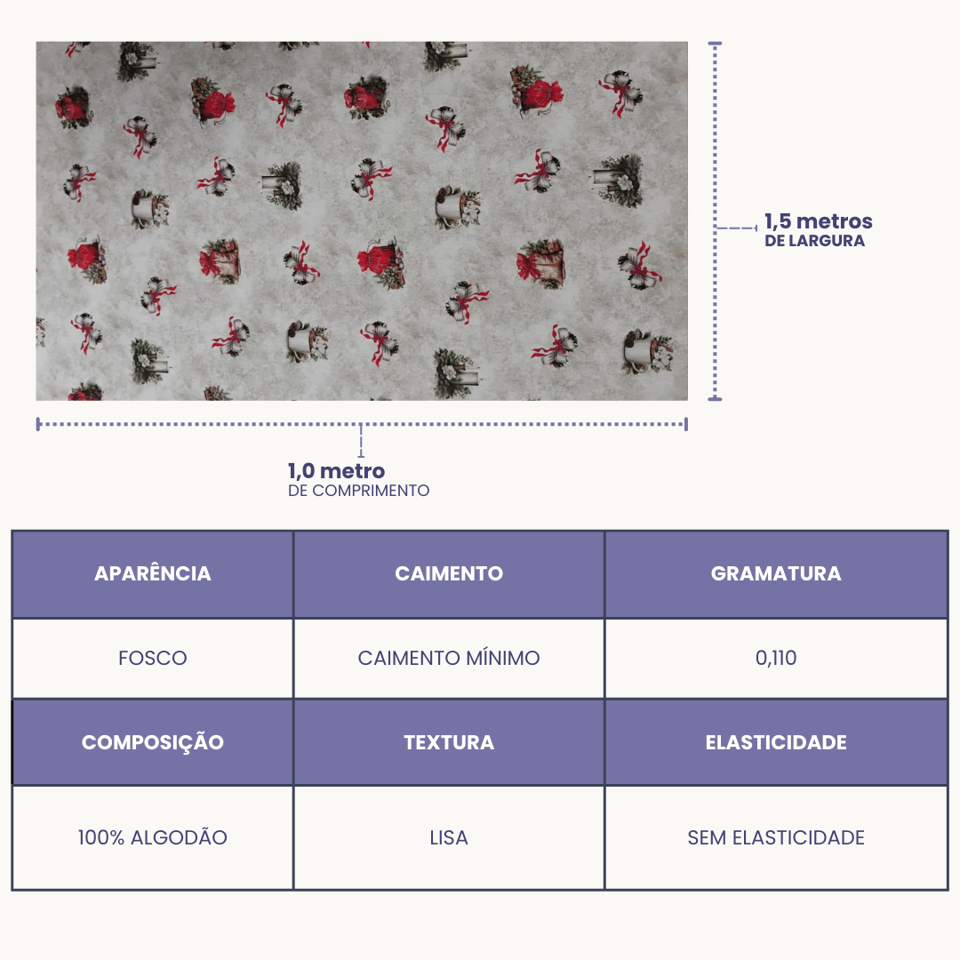 Uso Indicado: Jogos americanos, toalhas, painéis, saquinhos para presente, enfeites natalinos, almofadas, patchwork, decoração de mesa e mais.